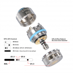 Among the accessories you will find an airflow ring that will screw under the base of the RBA and an airflow reducer MTL. Depending on your tastes, you can prefer direct vape (DL / without airflow reducer) or indirect vape (MTL / with this reducer). The airflow reducer will be placed at the bottom, the different diameters of air intake with and without this reducer are also marked.